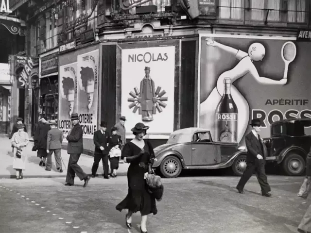 1936年.法国巴黎最时尚地区街头的行人,街道两旁林立着彩票和苦艾酒的广告。