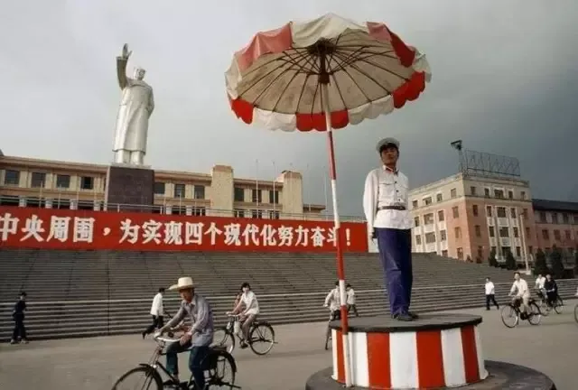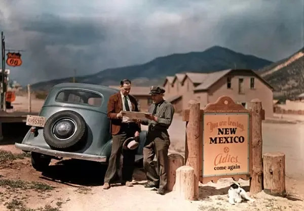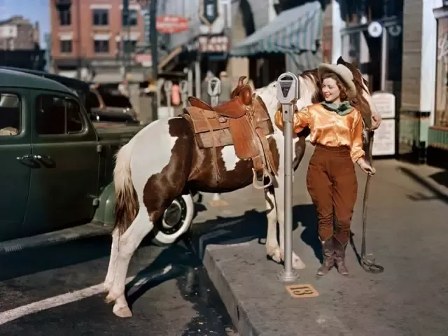 1939年10月,美国德克萨斯州,一名女牛仔站在停车计时器旁,似乎在为她的马付“停马费”。路易斯·马登/摄。