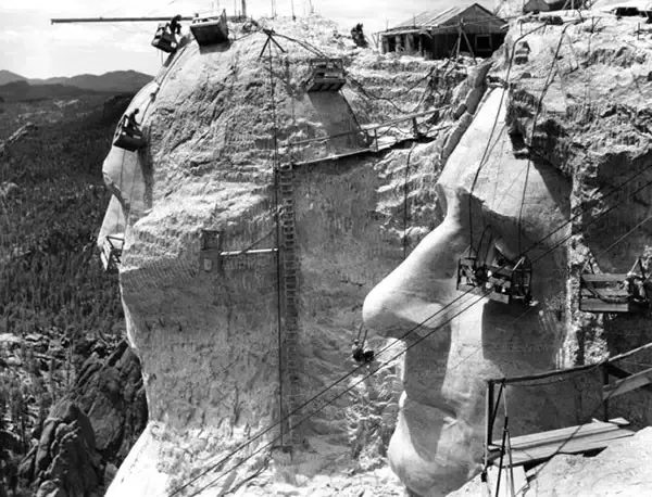 1939年,美国,罗斯摩尔山的托马斯•杰斐逊雕像正在建造中。