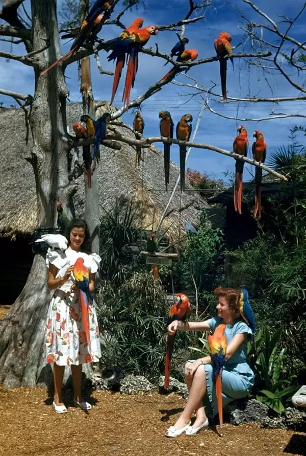 1950年11月,美国迈阿密,鹦鹉在游客手臂以及树木上休息。