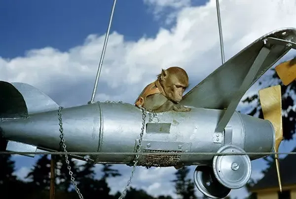 1951年1月,美国新罕布什尔州,一只猴子在“驾驶”一架模型飞机。