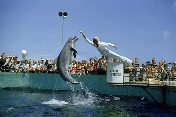 1952年11月,美国佛罗里达州海洋世界,驯养员在表演中喂海豚。
