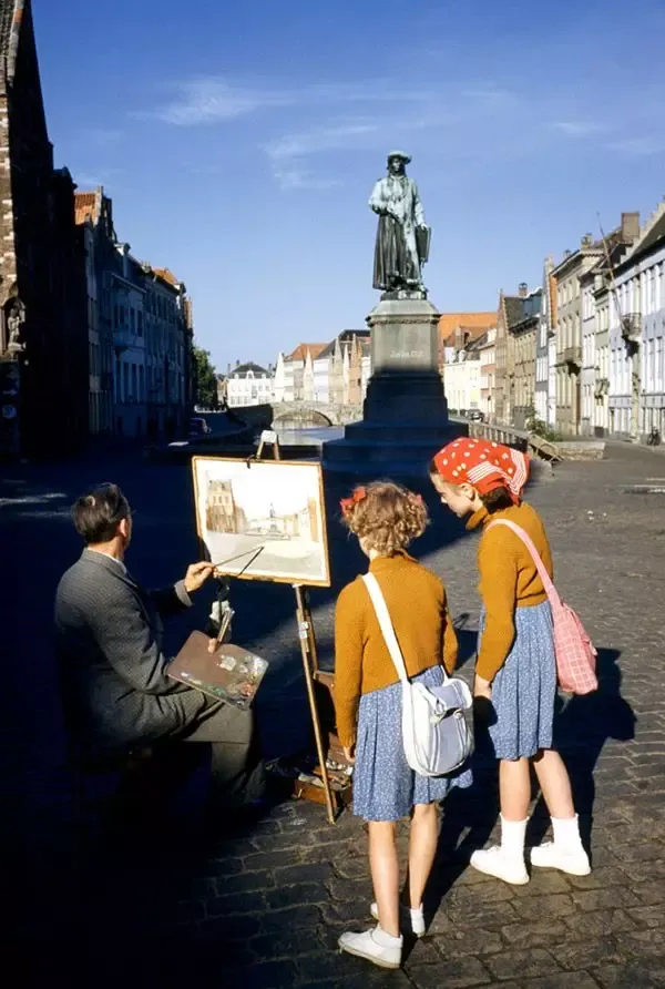 1955年5月,比利时,两个小女孩观看一位正在写生的艺术家。