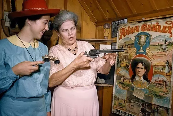 1955年4月,美国,安妮·欧克丽的外甥女正在向一位女顾客展示安妮的纪念品。安妮·欧克丽是十九世纪闻名美国西部的女神枪手。