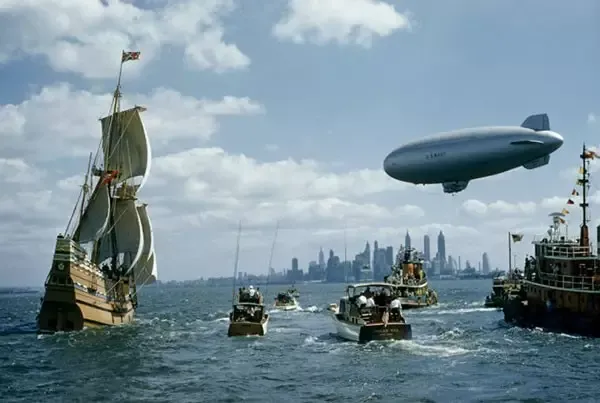 1957年11月,一艘“五月花”号的复制品在欢迎舰队的陪同下驶入纽约港。