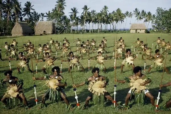 1958年11月,斐济,舞刀弄枪的男人们,用棕榈叶做盾。