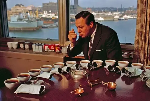 1964年9月,美国马里兰州,一位职业品茶者正在从桌上的不同茶碗里取样品尝。Bates Littlehales/摄。