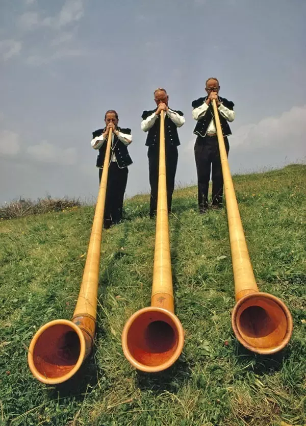 1973年,瑞士的高山节上,几个人在演奏长达12英尺的山笛。