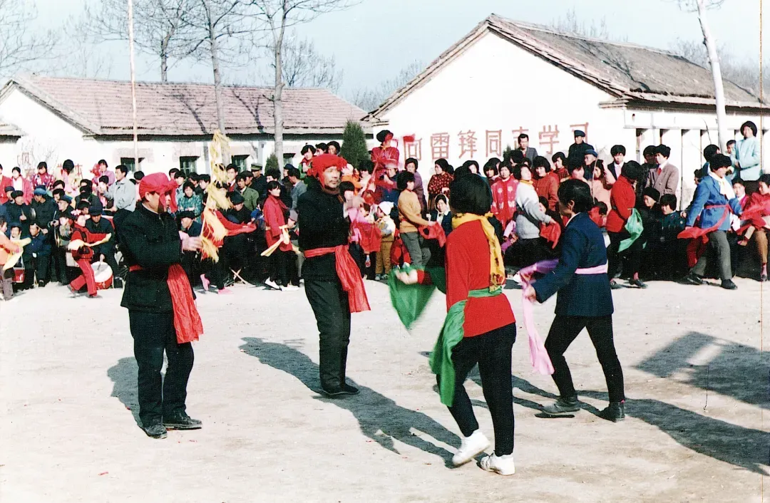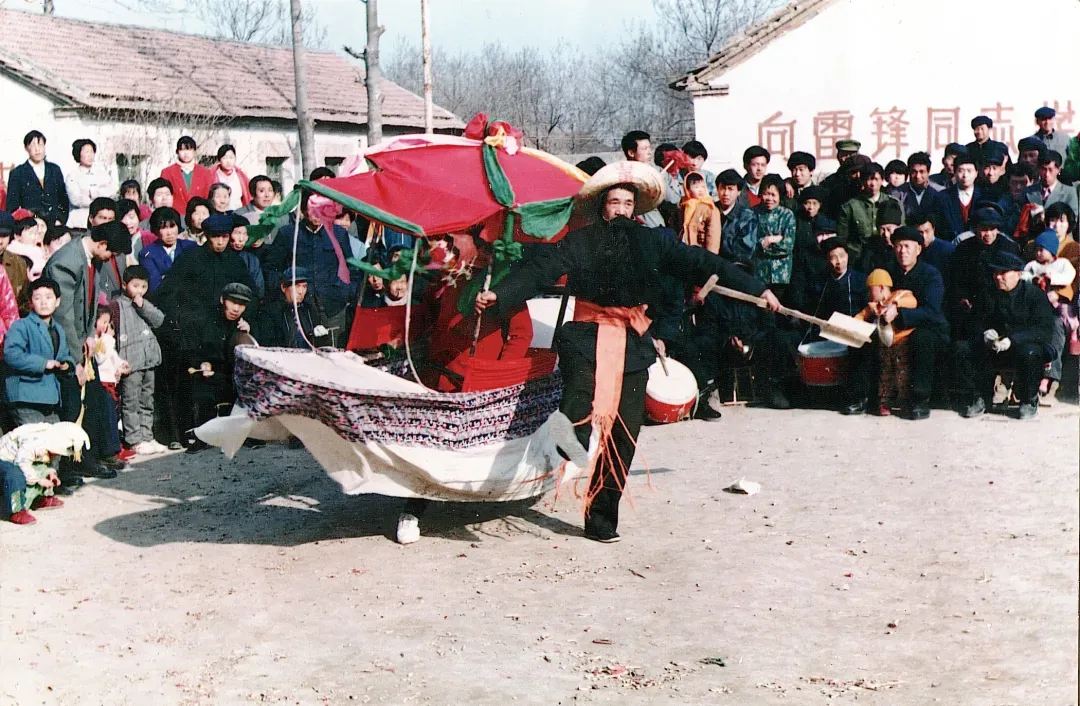 果里镇西埠村,多年来有正月十五民间扮玩的习惯。参加者上有七八十岁的老人,下有十来岁的儿童。兴盛年代有380余人的扮玩队伍。节目有踩高跷、跑旱船、舞狮子、跑龙灯,扭秧歌、骑毛驴及扮大头娃娃等。下面是西埠村1990年元宵节,民间扮玩活动部分节目留影。(照片提供者:祁志发)