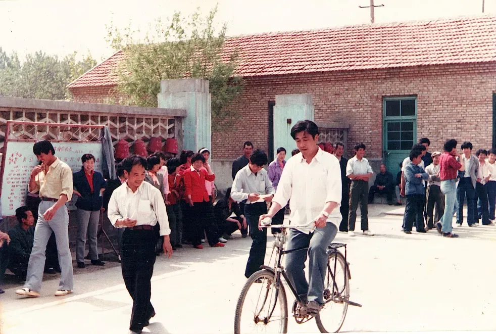 淄博第一油棉厂(原桓台县果里油棉厂)建于1982年,曾被评为省市县供销系统先进单位。为丰富职工的业余文化生活,增加企业凝聚力,每年收购加工淡季,组织职工开展体育、文艺和技能比赛。图为1990年4月厂里首届职工运动会,自行车慢骑比赛的场景。骑自行车者为照片提供人。(照片提供者:王立恩)