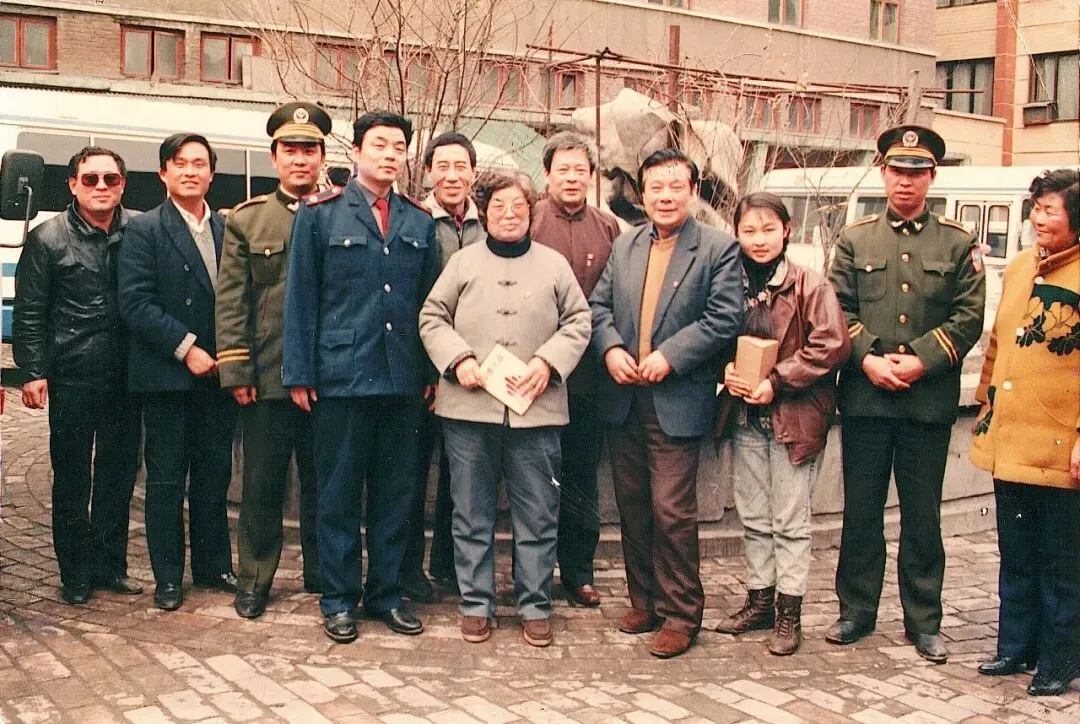1991年电影《县委书记的好榜样焦裕禄》在桓台上映前,焦裕禄夫人及儿子在桓台与观众见面会后同桓台电影公司的工作人员合影。左一为照片提供者。(照片提供者:巩子奎)