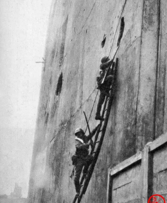 图中这拨背着钢盔攀着梯子的身影就是在四行仓库墙下的中国士兵,墙面上坑坑洼洼全是弹洞,梯子斜着贴住水泥墙,人一手攥绳一手探步,脚下一滑就可能摔下去,照片定住的那一瞬,是他们把命交给绳结和脚腕的时刻.