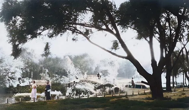 这片树影下的水面是西公园,拱桥像弯在水上的眉毛,岸边草长得软,姑娘穿着浅色裙子在影子里说话,我记得第一次去公园,是抱着纸袋面包坐在草地上,蚂蚁从鞋面爬上来一点不怕,现在叫胜利公园,游乐设施多了,灯带也亮,夜里人更多,水面还是那样安稳。