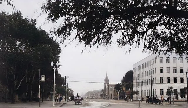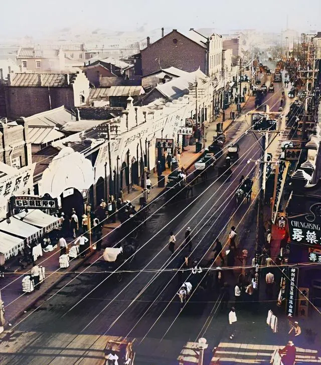 这段直来直去的路就是现在的长江路,照片里能看见马车从阳光里驶出来,边上店牌清一色竖写,行人把影子踩得长长的,遇到下雨天,鞋底黏着泥一脚一脚挪,现在车道画得明白,路口灯一亮一灭,节奏换了,街心那股子通透劲还在。