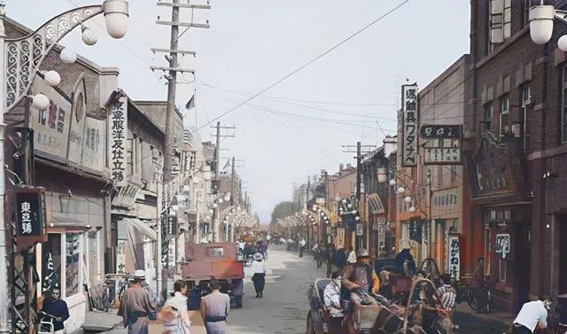 这个斜着甩出去的街叫日本桥通,起点连着站前,路牌当年换过几回名,店面细长,挂满竖匾,车辙在地上压出浅浅的亮,爸爸说那会儿过这一带要会看路牌,名字一改就容易走岔,现在改名胜利大街,导航一搜就到了,人省事了,路的骨头没变。