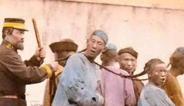 外国人拽着清朝人的辫子,用棍棒驱赶,那些人的辫子被绑在一起,脸上写满了认命和无奈,不争不反抗,任人摆布,这就是积贫积弱的晚清.