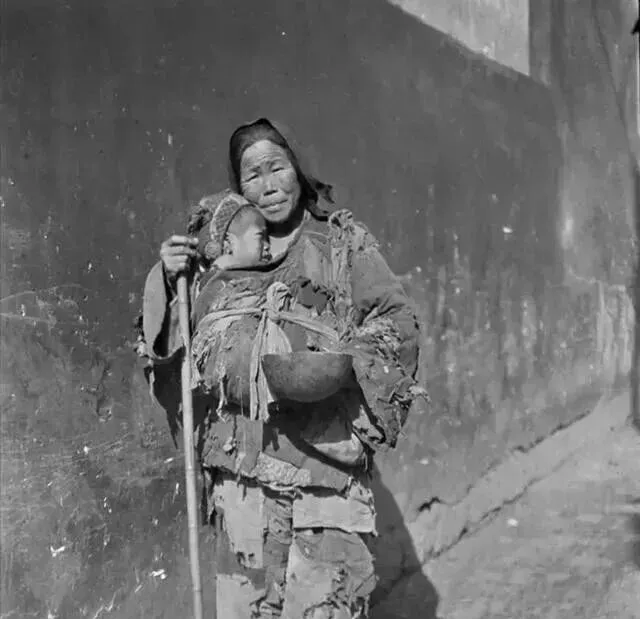 最让人心碎的是这张,讨饭的母子,孩子在襁褓里饿得直哭,妈妈一脸麻木,穿着破烂的衣服,拄着棍子,没有田地没法打工没有收入,一切听天由命,那个积贫积弱的年代,活着本身就已经拼尽全力了.