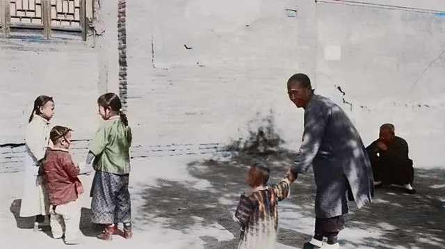 几个孩子围着玩,小男孩被奶奶牵着,小辫子在脑后晃,墙根下坐着歇脚的老人,影子把地面分成明暗两块,话也不多,日子就在这样的慢里过出滋味。