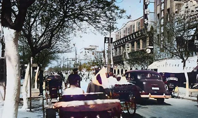 街上一半是人力车,一半是小汽车,路两边的招牌高高挂着,字大得不能再大,树影透在路面上,商号门口有人探着身子看热闹,以前叫王府街,十王府在这儿落座,现在成了买买买的地界,气派没变。
