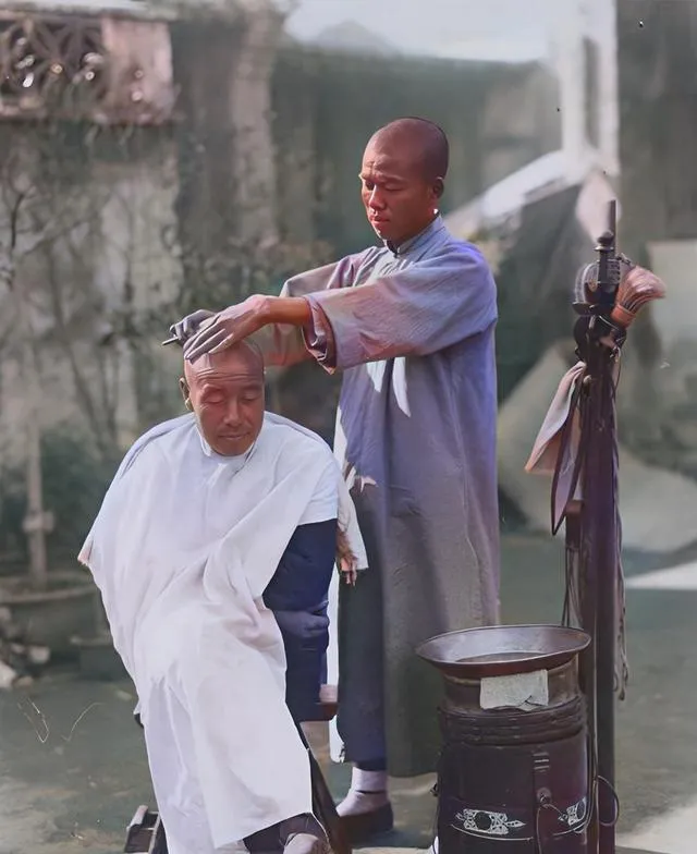 这个流动理发师利落得很,左手扶头,右手一推,旁边铁炉子上热水咕嘟咕嘟冒,小椅子窄窄的,客人裹着布单坐稳,师傅说,别动啊,一会儿就清爽喽,现在一进理发店一堆项目,那时候剪完就走,干脆。