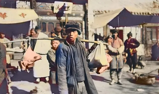这位小伙子肩上挑着木棒,两头各挂着一包肉,帽檐压低,步子往前抢,旁边有人跟着问价,摊位冒着热气,那时候买肉讲究眼明手快,手慢了就只剩骨口袋了。