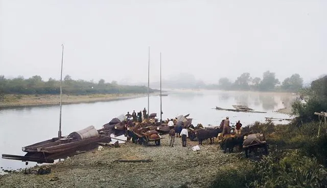 这个静静躺着的地方是蛟河边的小码头,木船靠着鹅卵石滩,桅杆细长直指天,工人们抡胳膊卸货,背篓挨着背篓,雾气罩着水面,连说话都带着潮乎气儿,那时候靠河吃饭的人多,早上听见橹声,心里就踏实了。