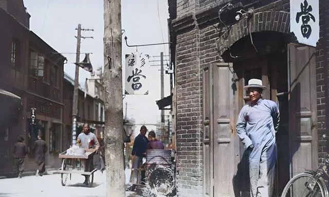 这条笔直马路店铺一字排开,门脸有中有西,牛车过了留下一道新泥,人行道铺着方砖,脚底板踩上去带点回音,我爱看招牌上那些手写字,瘦金也有,馆阁也有,写得有骨气。