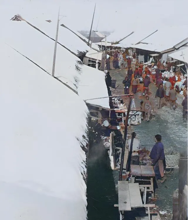 这条被雪压低屋檐的街是冬日露天市,摊子一溜儿摆开,蒸汽从锅里冒出来,白雾腾起盖住人脸,脚下吱呀的雪脆得很,孩子跟在大人身后钻来钻去,买一把热乎烧饼揣怀里,一路吃一路哈气,简单却痛快。