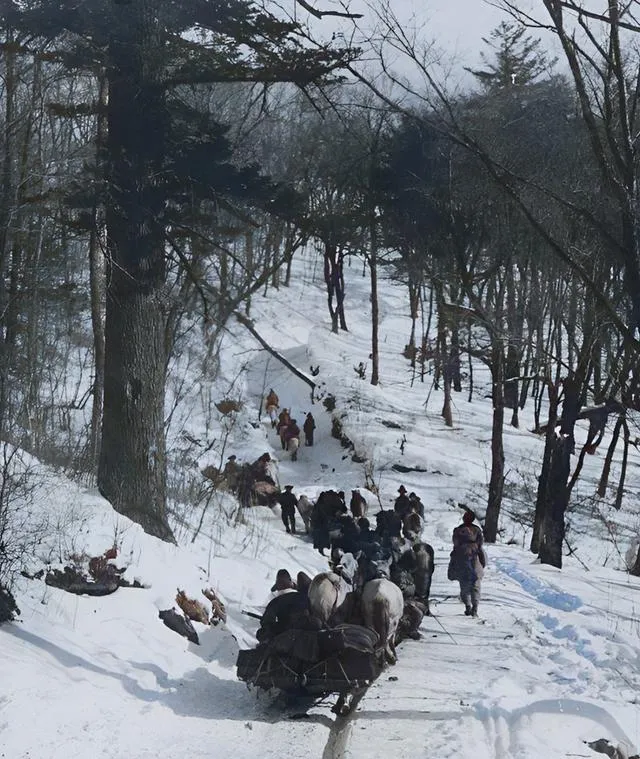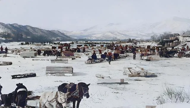 冰面上码着方木,马在雪地里蹬着蹄走“S”形,赶车人披着毡斗篷,甩鞭子不带狠劲,只听得皮绳甩风声,交易一成,木头上粉笔一划,装车走人,干脆利落。