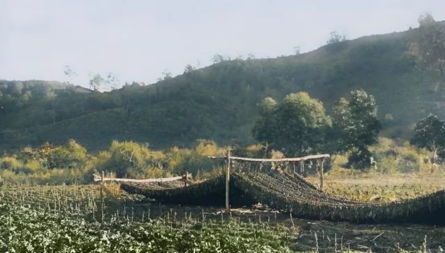 田埂里架着木框,这就是晒烟叶的架子,叶片一串串垂着,颜色从青转黄,再晒就成油光发亮的褐色,远远看像披着围巾的小山坡,农忙的时候,手臂上全是烟香的味儿,洗都洗不掉。