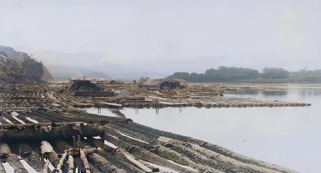 水面上连着一排排原木,是江上木排,木屋搭在排上当临时窝棚,顺流而下靠桨掌着方向,夜里把排拴在缓处,炉火一烧,河风往屋里钻,人缩在被里听水声,想家也就那会儿最明显。