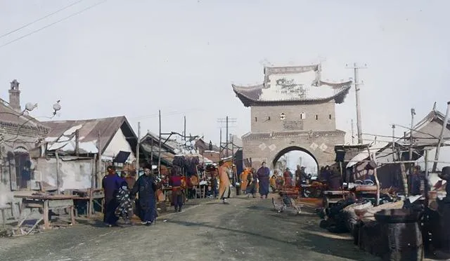 图中这道欧式门楼就叫朝阳门,当地人也喊大东门,铁廊子上悬着大字,门边立着岗亭,电线杆顺街站成一排,人从缝里挤过去,肩碰肩的热闹劲儿一下就上来了,奶奶说集市一开,这口门前最旺,转弯就是卖布的铺子,掂着尺子哗啦响。