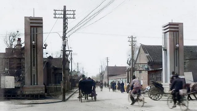 这对立在街头的新式门柱挺洋气,竖向线条一条条上挑,夜里灯泡亮起来很精神,黄包车从柱下穿过,车夫腰一躬,车辙在地上留两道闪亮的线,现在再看这风格,还挺前卫。