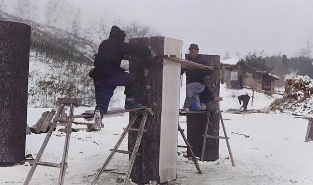 画面里两个人踩着木梯,合力锯开一根大木,锯条来回拉,雪地里噌噌冒木屑,手上通红却不喊冷,等分成小料,装到爬犁上,一趟趟驮到场里,都是硬功夫。