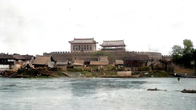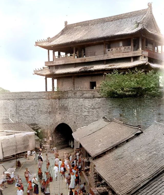 图中高挑的城楼就是涵泽楼,下面一抹黑的拱洞是北门大安门,砖缝里长着草,檐角挑得老高,门外摆着摊子,鸡犬跑来跑去,老人说以前进出京官都从这门过,现在只剩老照片给我们作证。