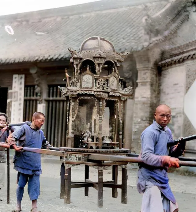 这个木制的神龛雕花精细,四根抬杆扛得稳,香炉里还冒着细烟,抬轿的汉子眼神正,脚下步子齐,街门口有人合掌作揖,一阵敲锣打鼓,整个巷子都醒了。