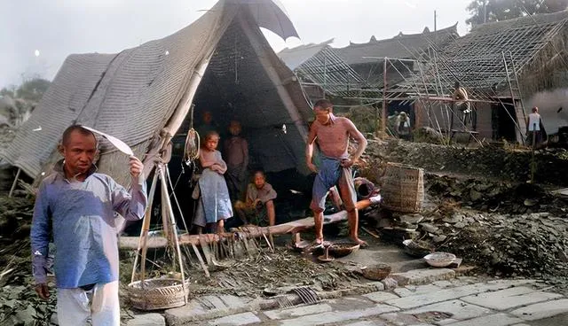这两张最揪心,砖瓦碎成一地,竹架子支起半边天,女人把被褥抖开搭在绳上,男人拾掇锅碗瓢盆,孩子蹲在瓦砾边数石子,奶奶说,当年“先找锅,再找饭勺”,有锅就能把日子续上。