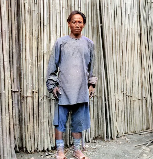 这个人站在竹竿旁,蓝灰色的衣裳洗得发白,脚上草鞋系得紧紧的,竹节一根根亮出油光,手一推,整捆就“沙啦啦”响,他笑说“客官要多粗的”,声音很快活。