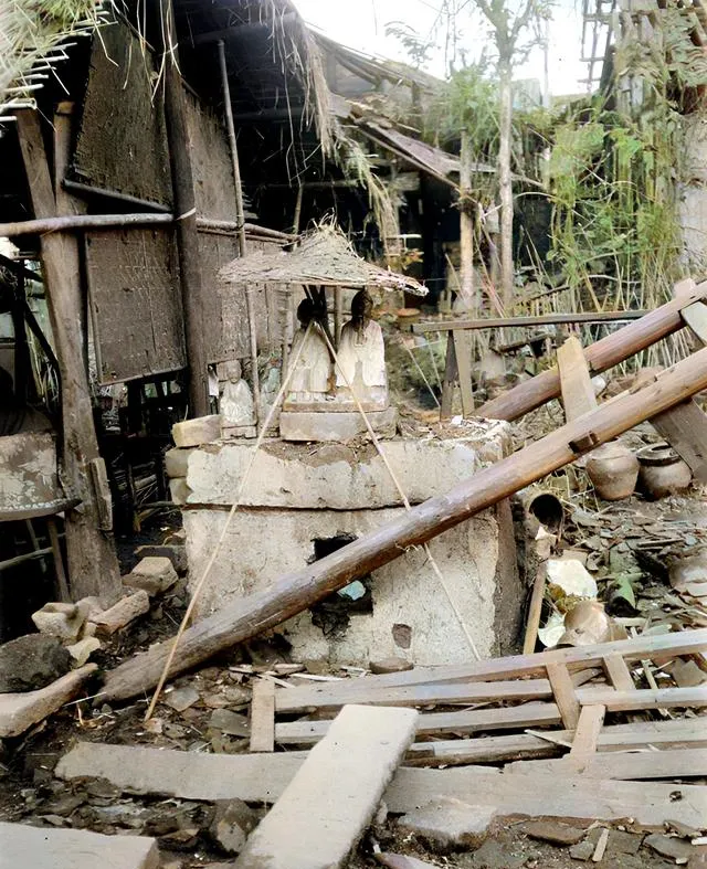 这个土台上立着几尊小神像,顶上罩一顶破斗笠,边上斜插两根竹竿撑着,木梁歪着压来,像随时要塌,但人还给神像留了个安生处,旧时的人敬天敬地,办法总比难多一点。