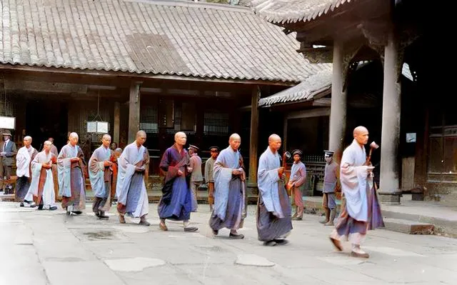 队伍里僧人袍袖拂地,手里各捧着法器,前后脚步整整齐齐,旁边站着几位身穿制服的守卫,钟声一下,院里的鸽子扑棱一片飞起,那感觉安稳而庄重。
