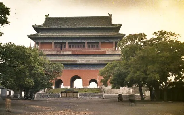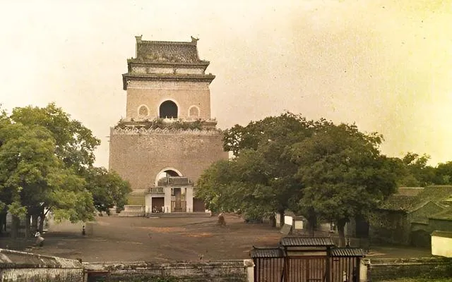 图中高大的灰砖建筑叫北京钟楼,方正的台身上托着重檐顶,拱券门洞像张着的大口,前面这一大片空场子,在那会儿像个天然的约会点,树影拖得很长,门洞里透出来的阴凉,走进去能听见脚步声在墙里回响,爷爷说,过去这口子北边再往前就是鼓楼,晨钟暮鼓一句话,就把城里的作息都说全了。