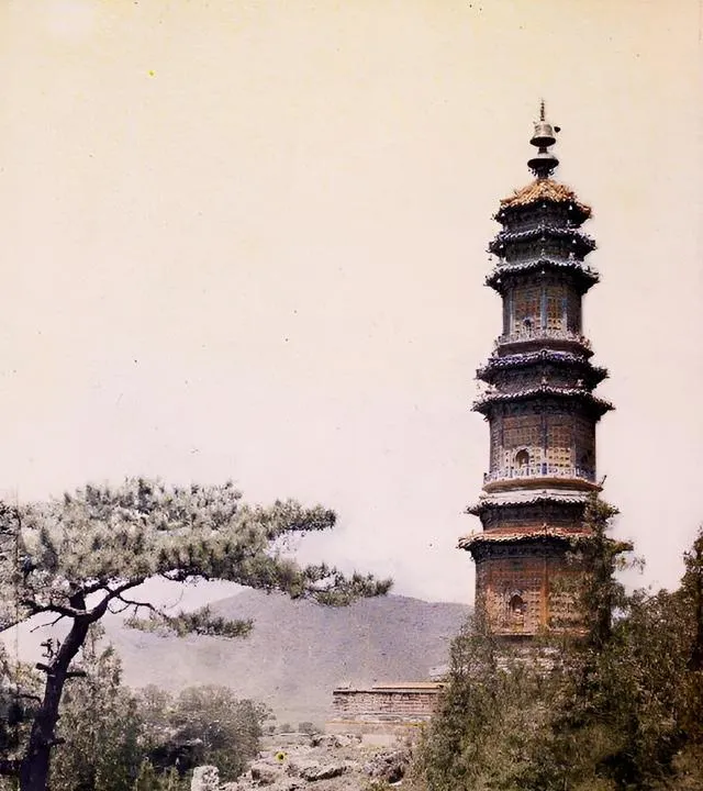这座塔通身嵌着琉璃砖,颜色深浅不一,远看像披了一层细鳞,旁边的松树枝杈伸过来,风一过,塔檐下的风铃应当是要响的,只是照片里听不见。