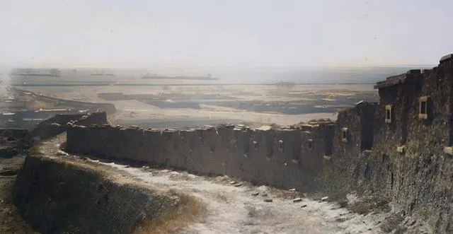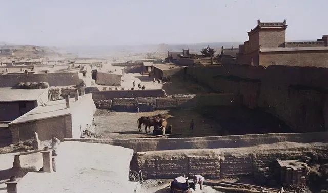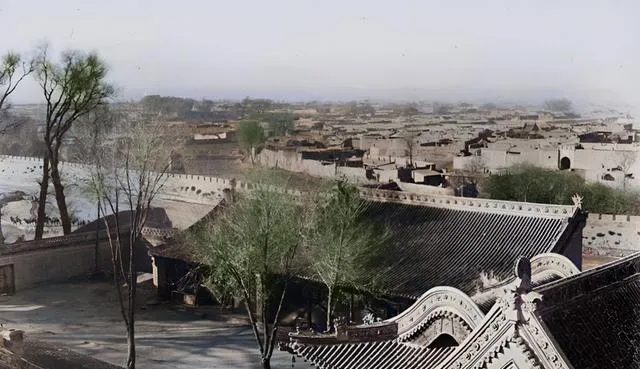 图中高高的土城墙把城圈成一块,屋脊压得低低的,灰瓦被风沙磨得发亮,近处院落飞檐挑起,像一只展翅的鸟,爷爷说那会儿进城要看天色,风沙大就得提早收摊,不然出了南门就容易迷路。