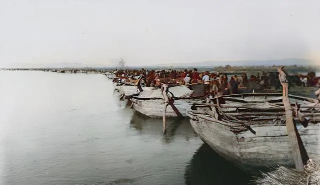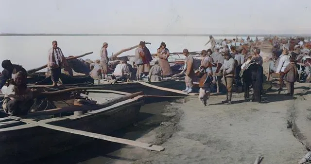 船头靠着滩涂,乘客排队上船,男人们肩上扛着麻袋,妇人抱着孩子,小伙子帮着扶桨,等最后一人跨上去,船身一沉,水纹就开了花。