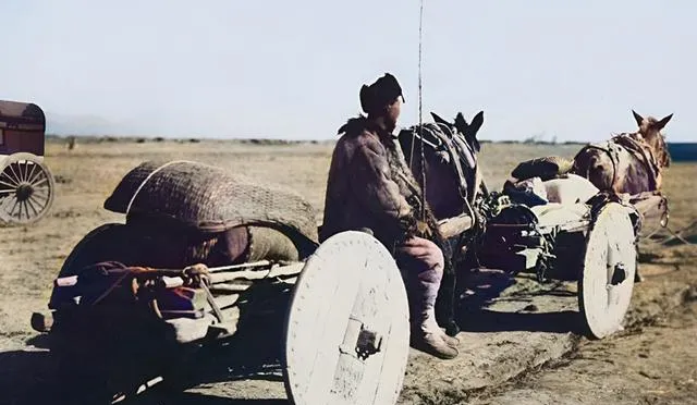 这个车的轮子是整块木板拼成,钉子密密扎成圈,车夫穿着皮袄坐在前梁上,手里的鞭子不怎么落,马顺着车辙找路,听话得很。