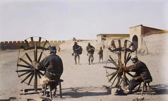 这两架大纺车一左一右,轮子像太阳,手摇脚带,线在指间穿梭,远处的人正要进城,背上带着风尘,奶奶说那时候进门第一件事,是在井边抹一把脸,灰一落,脸就亮了。
