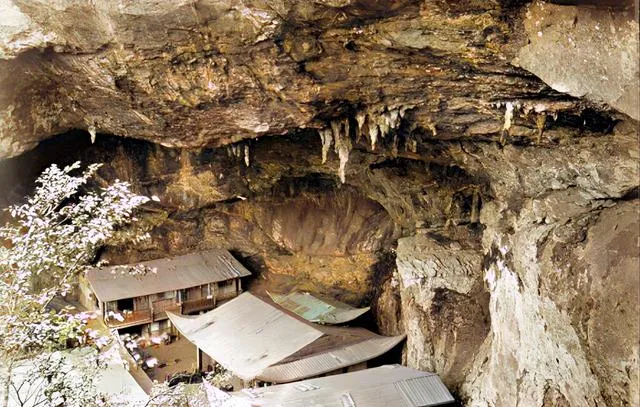 这处像天生的屋檐是岩洞,洞里搭着木屋和佛殿,檐角低低压着香烟气,石壁上水珠一点一点滴,钟声闷着传出去,很灵。