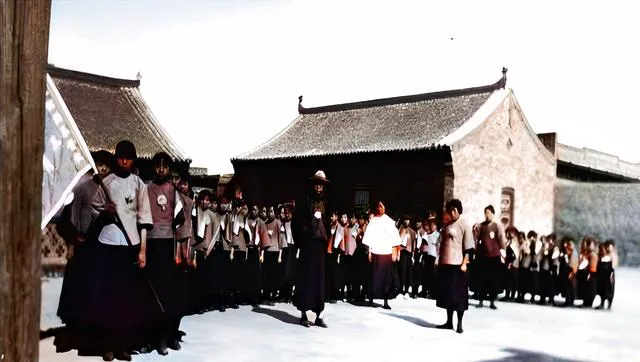 这群穿着统一上衣的学生在操场集合,前头的姑娘举着校旗,老师拿着本子点名,阳光晒在青砖地上亮得很,照片里看不见笑,却能听见年轻人的脚步声。