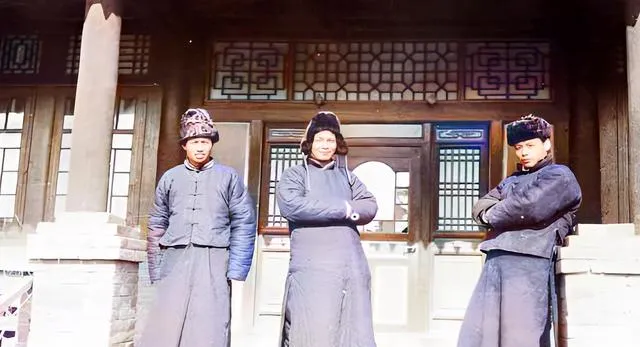 这三位站在屋檐底下,棉袍鼓鼓的,皮帽压得低,双手插在袖里,太阳斜着照过来,脸上半明半暗的,摄影师让他们别动,他们就这么稳稳地看着镜头。
