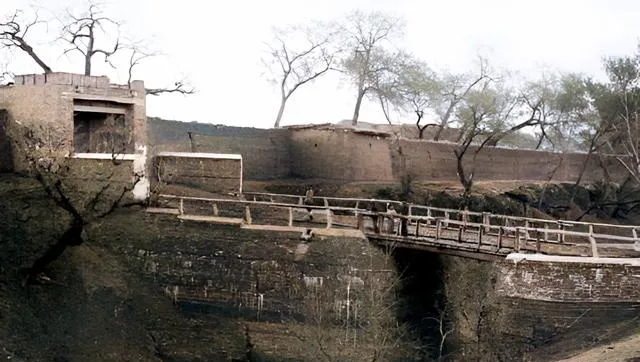 这个土色的高台就是城墙,门洞方正,上头一排垛口像牙齿,门外本是护城河,照片里却干裂见沟,木便桥横着过去,奶奶说那时风沙大,雨水少,过桥得提着袍摆小心踩空。